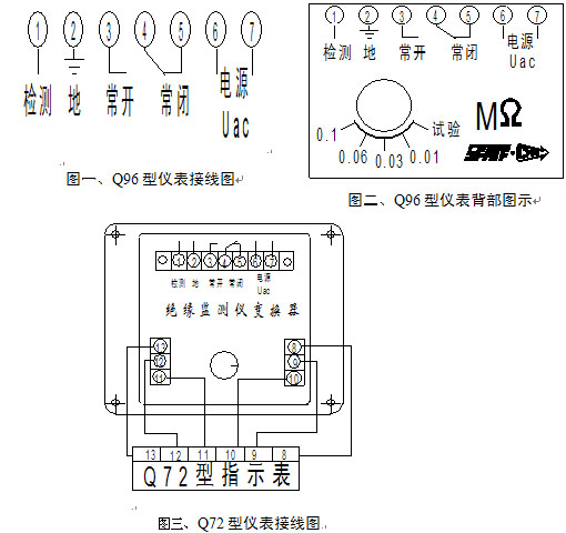 主要參數(shù)和技術(shù)指標(biāo) ● 儀表指示偏轉(zhuǎn)角:Q96-MΩA、Q72-MΩA,90°Q96-ZMΩA、Q72-ZMΩA, 240° ● 使用環(huán)境溫度范圍:-25℃~+55℃ ● 耐振動(dòng):頻率1~100Hz,加速度≤10m/s2 ● 絕緣強(qiáng)度:線路對(duì)外殼2000Vac,1min ● 外磁場(chǎng)強(qiáng)度:≤400A/m ● 儀表準(zhǔn)確度等級(jí):⑩級(jí)(基準(zhǔn)值為指示值,按GB/T7676-1998中相關(guān)要求) ● 工作電源容差:100Vac(或220Vac)±15% ● 儀表消耗功率:不大于5VA ● 輸出觸點(diǎn)容量:阻性,28V,5A;220V,1A ● 報(bào)警設(shè)置及容差:10kΩ±2kΩ;30kΩ±3kΩ 60kΩ±3kΩ;100kΩ±5kΩ ● 儀表重量:Q96-ZMΩA、Q72-ZMΩA, 1.1kg Q96-MΩA、Q72-MΩA, 0.9kg |